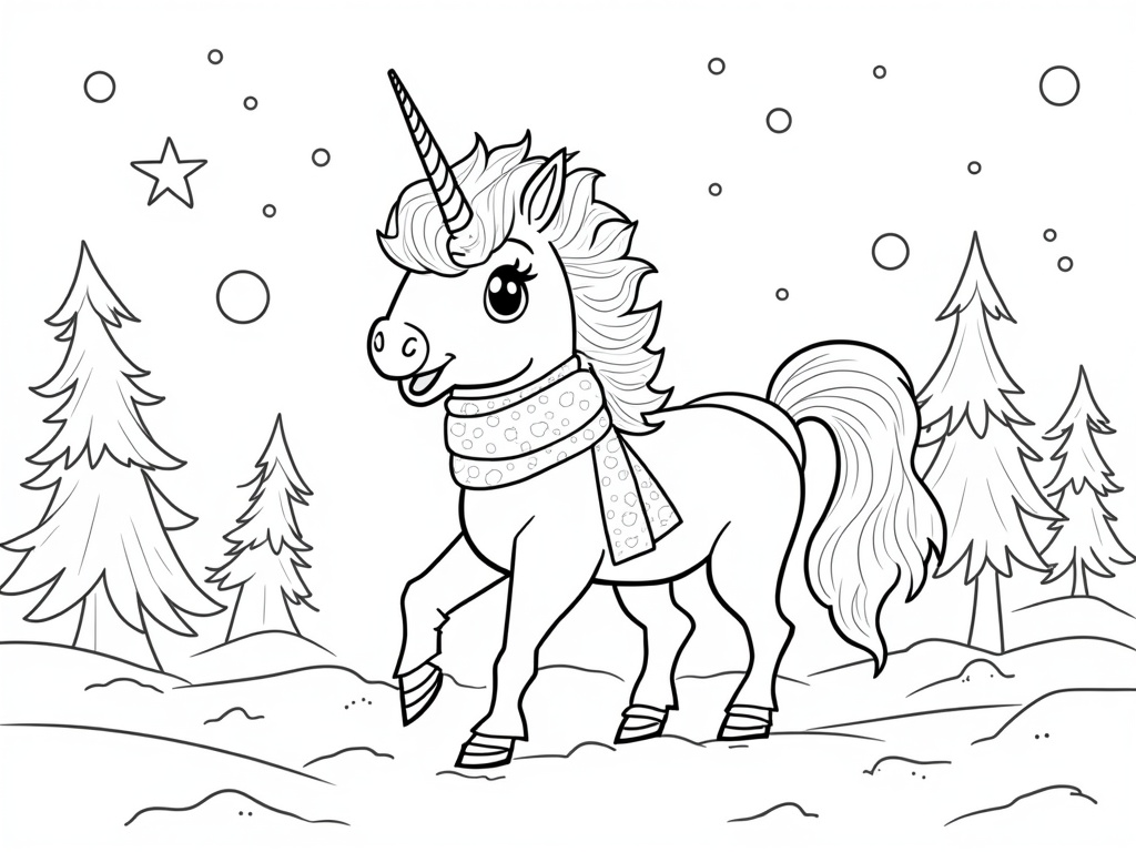 A fluffy-maned unicorn trots through gentle snow with pine trees, a scarf, and large snowflakes. Clean A4 black-and-white line art with bold outlines, simple winter motifs, and open spaces.