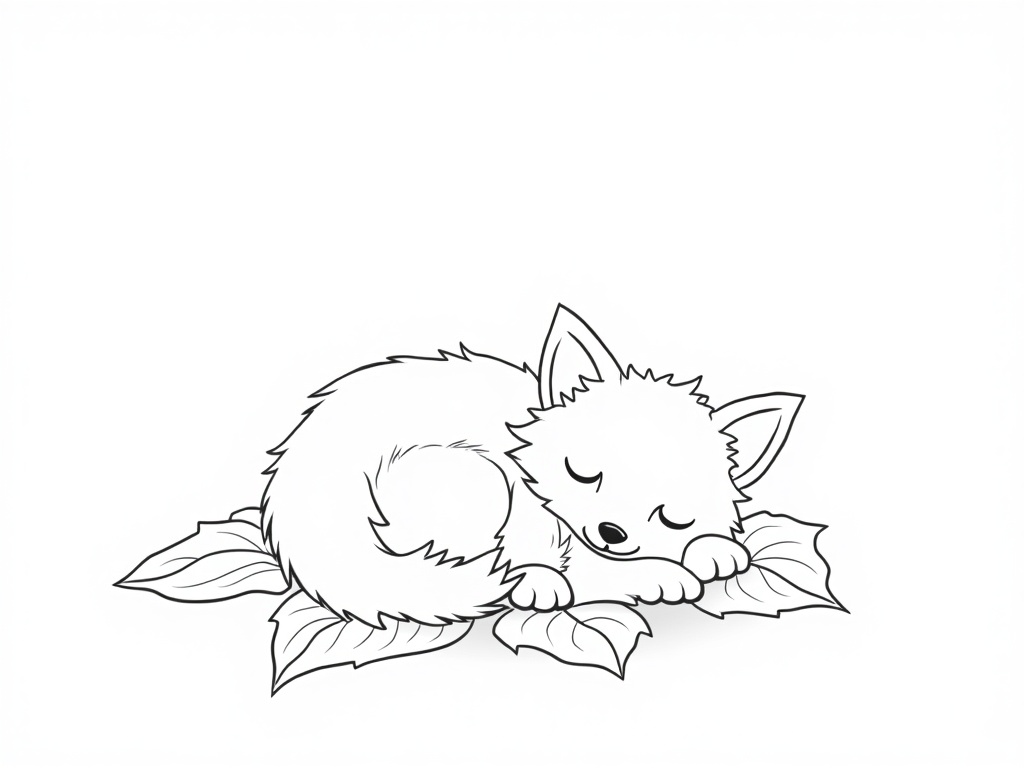 A tiny fox curls up on a bed of three big leaves with a mushroom and a simple tree silhouette behind. High-contrast line art, thick outlines, A4 portrait black-and-white page with easy shapes and no shading.
