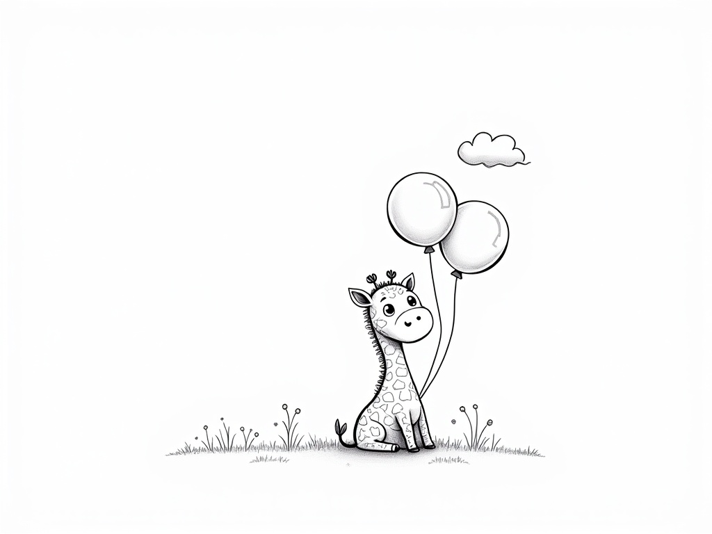 A small giraffe with cute spots sits and holds two round balloons, with a few tufts of grass and a cloud. Strong, clean outlines, simple shapes, black-and-white A4 portrait coloring page with wide margins and no shading or background clutter.