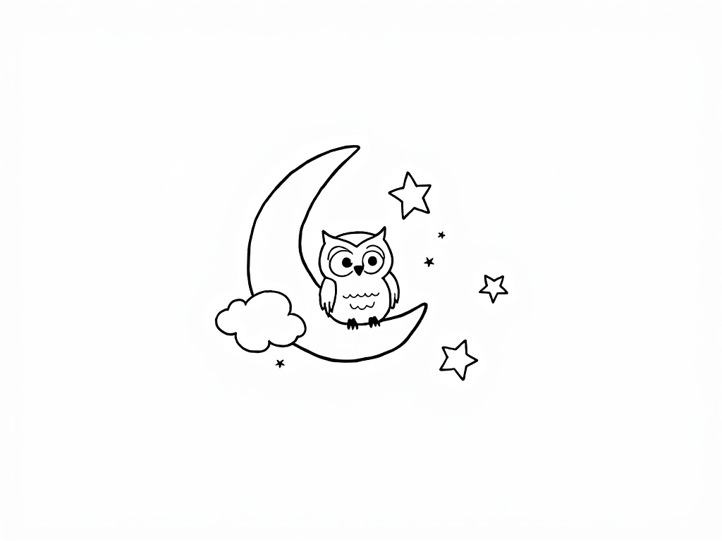 A round baby owl perches on a crescent moon with three large stars nearby and a soft cloud below. Bold, clean outlines only, A4 portrait black-and-white coloring page with big simple shapes and no fine details.