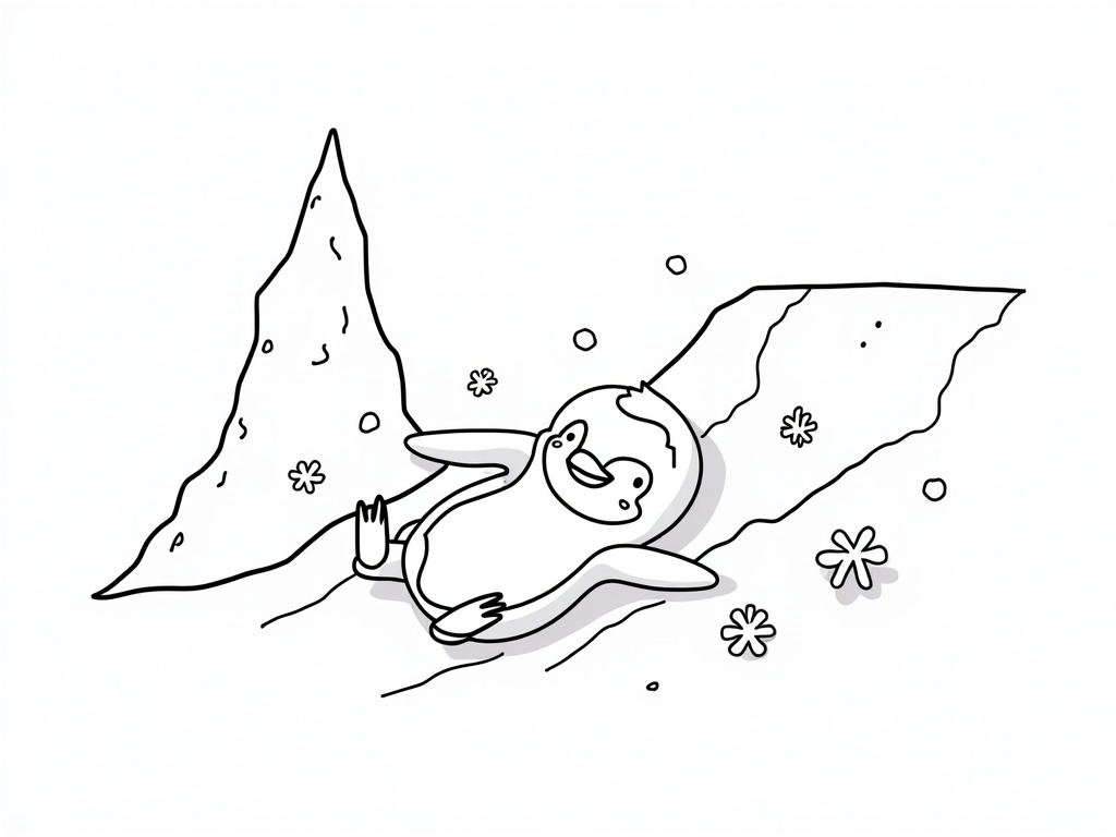 A baby penguin belly-slides down a gentle icy slope with a smiling face, a couple of large snowflakes and a simple iceberg behind. Thick cartoon outlines, uncluttered composition, A4 portrait black-and-white coloring page with no shading or intricate details.