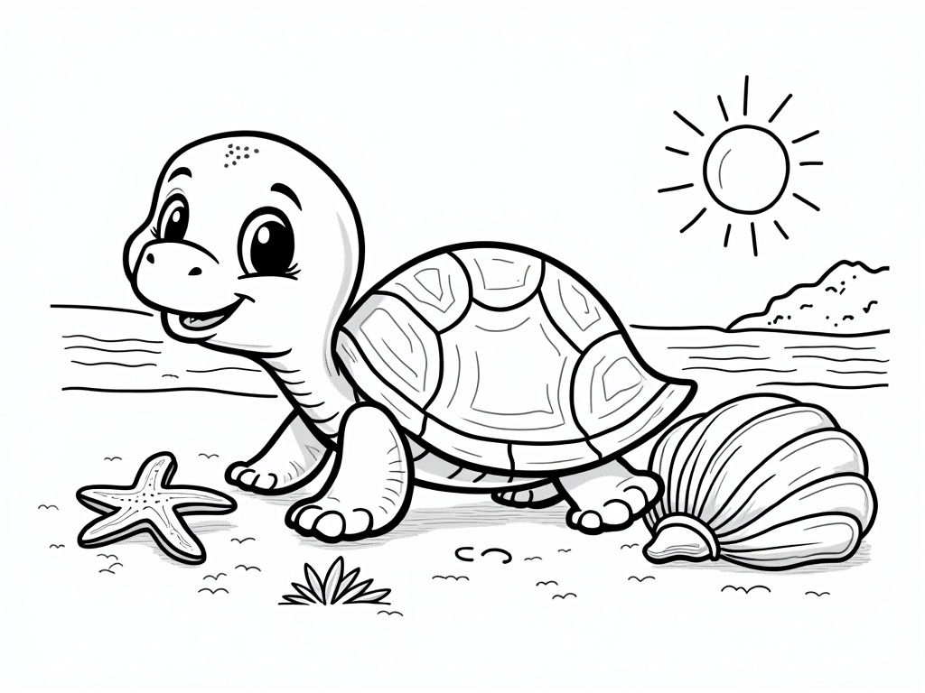 A smiling baby turtle waddles near a big seashell and a starfish, with a gentle wave line and a sun in the corner. Thick bold lines, simple forms, A4 portrait black-and-white coloring page with large open spaces and no small textures.