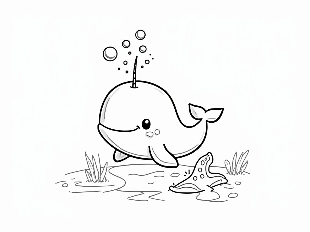 A cheerful baby whale spouts a tall splash with big round bubbles and a smiling starfish below. Thick outlines, minimal background, black-and-white A4 portrait coloring page with large open areas and no shading.