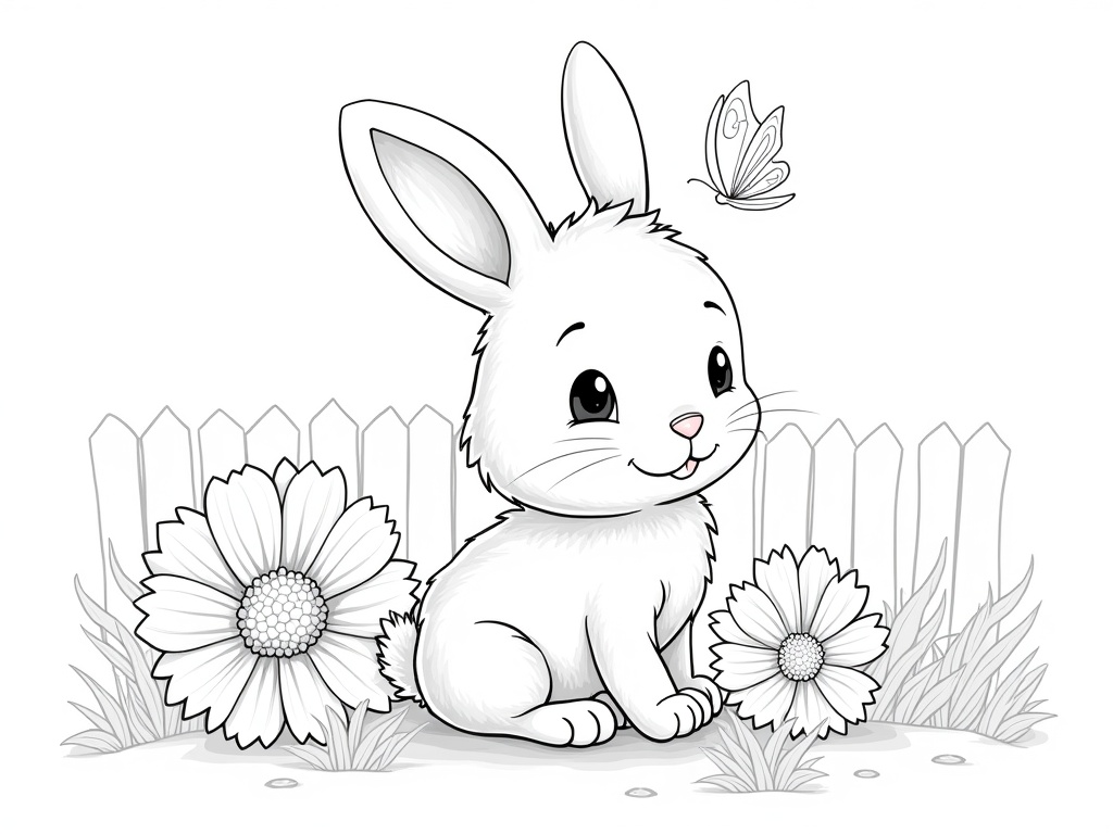 A fluffy baby bunny sits among three big daisies with a butterfly overhead and a simple picket fence line behind. Heavy outlines and large coloring areas, black-and-white A4 portrait page with minimal details and no gradients.