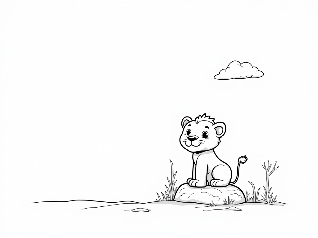 A cute lion cub sits proudly on a small rock with a tiny tufted tail, a few puffy clouds and a lone acacia tree in the distance. Bold, high-contrast outlines only, A4 portrait black-and-white page with simple shapes and plenty of white space, no shading.