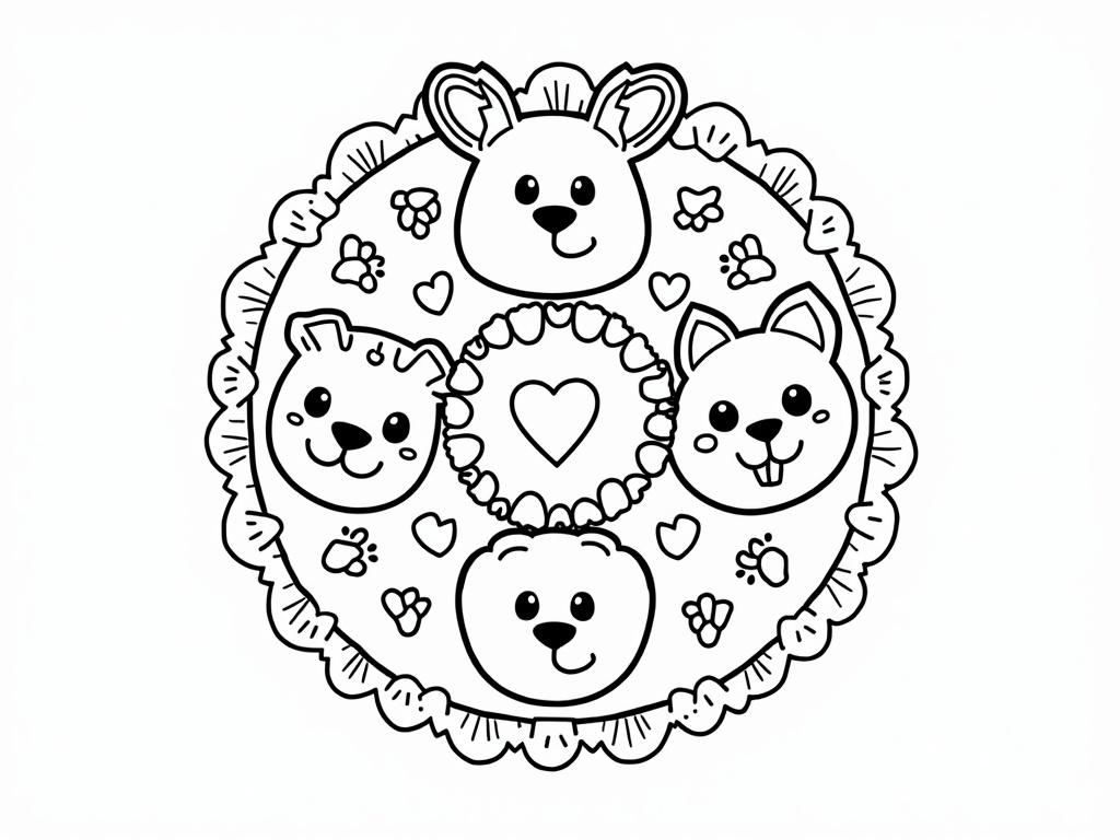 Cute animal faces (cat, dog, bunny, bear) repeat around a circular mandala with hearts and paw prints between. Bold, kid-friendly outlines in pure black-and-white with no shading; centered on an A4 portrait page with a clear background.