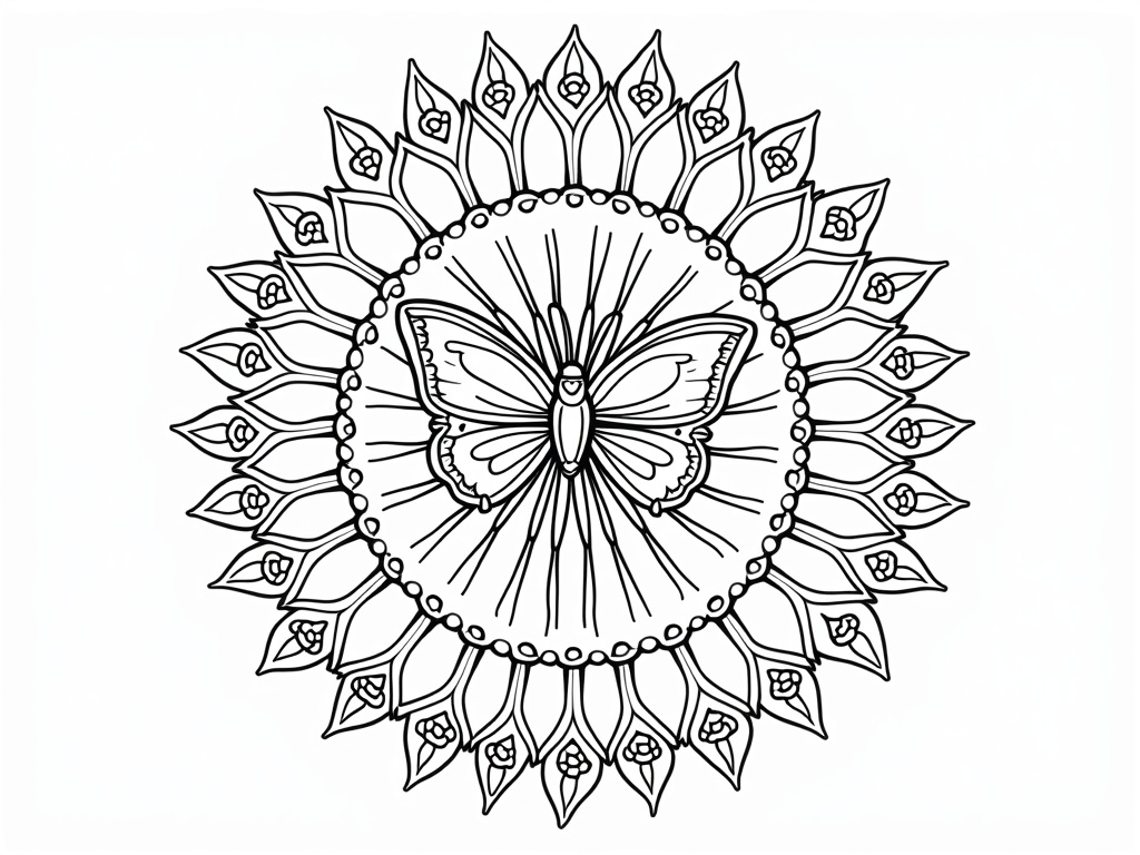 Butterfly wings and small flowers arranged in concentric rings create a gentle, airy mandala. Thick black outlines and simple details for easy coloring, no shading; centered on an A4 portrait page with plenty of white space.