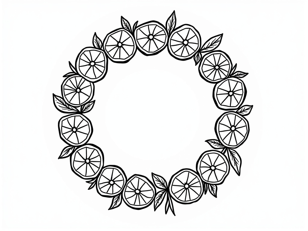 Wedges of oranges, lemons, and limes alternate with simple leaves to create a zesty circular mandala. Thick black outlines with clear seeds and segments, no shading; centered on an A4 portrait page with a blank background.