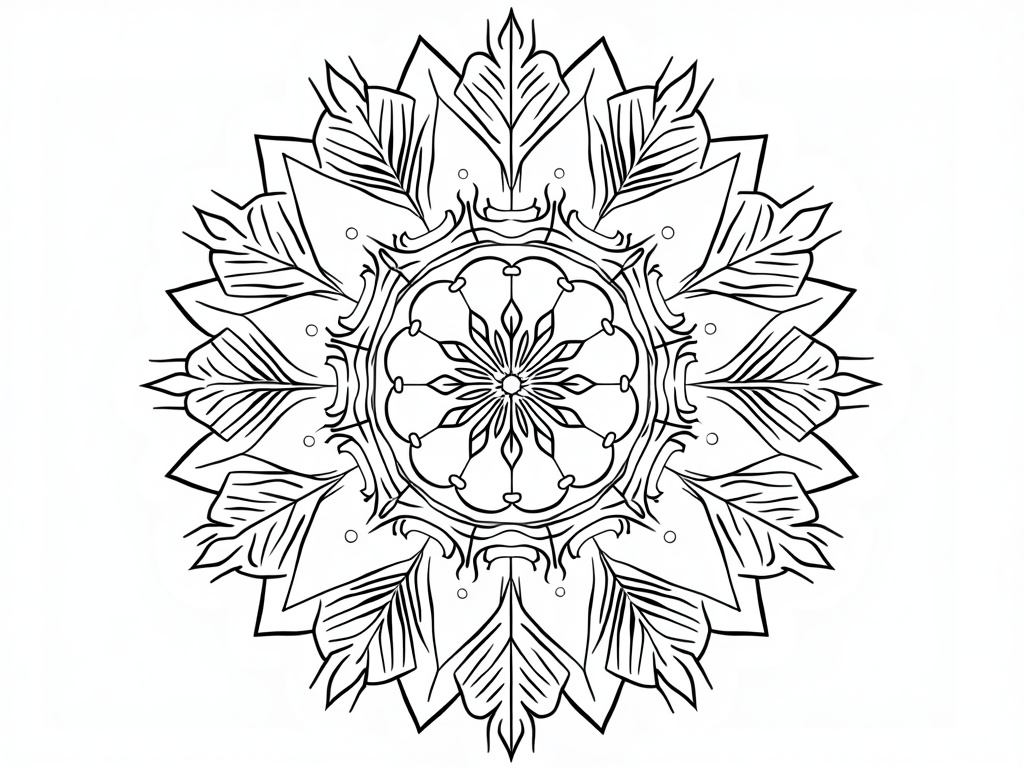 A crisp winter mandala built from snowflakes, icicles, and tiny dots arranged symmetrically in rings. Black-and-white line art with bold outlines and open spaces for coloring, no shading; centered on an A4 portrait with an empty background.